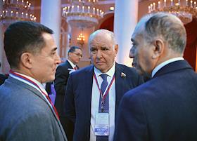 Учредительный форум неформального международного движения "Форум сторонников борьбы с современными практиками неоколониализма" – "За свободу наций!", организованный партией "Единая Россия" в Доме Союзов. Представитель в Совете Федерации России от исполнительного органа государственной власти Сахалинской области Григорий Карасин (в центре) перед началом форума.