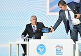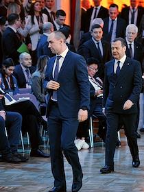 Учредительный форум неформального международного движения "Форум сторонников борьбы с современными практиками неоколониализма" – "За свободу наций!", организованный партией "Единая Россия" в Доме Союзов. Посол России в Белоруссии Борис Грызлов (второй слева), председатель партии "Единая Россия", заместитель председателя Совета безопасности России Дмитрий Медведев (в центре) и первый заместитель председателя Совета Федерации России, секретарь Генерального совета партии "Единая Россия" Андрей Турчак (справа) во время форума.