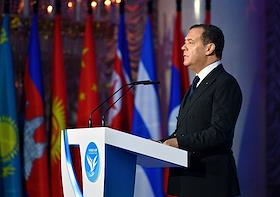 Учредительный форум неформального международного движения "Форум сторонников борьбы с современными практиками неоколониализма" – "За свободу наций!", организованный партией "Единая Россия" в Доме Союзов. Председатель партии "Единая Россия", заместитель председателя Совета безопасности России Дмитрий Медведев на форуме.