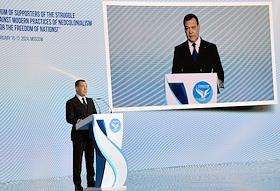 Учредительный форум неформального международного движения "Форум сторонников борьбы с современными практиками неоколониализма" – "За свободу наций!", организованный партией "Единая Россия" в Доме Союзов. Председатель партии "Единая Россия", заместитель председателя Совета безопасности России Дмитрий Медведев (справа) во время форума.