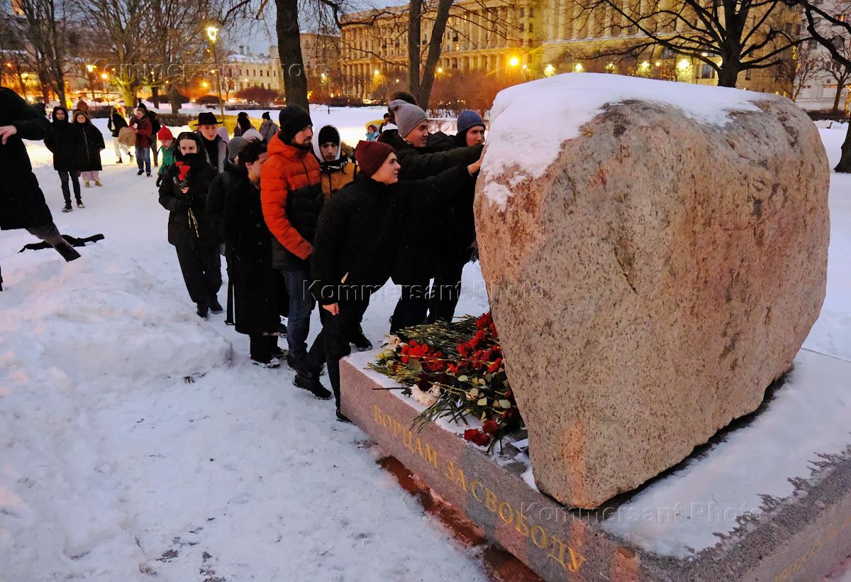 Стихийный мемориал у Соловецкого камня на Троицкой площади в связи со смертью Алексея Навального.