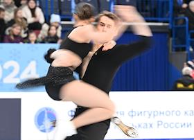 II Всероссийская Спартакиада по зимним видам спорта. Фигурное катание в Ледовом дворце (ЛД) "Металлург". Танцы на льду. Произвольный танец. Фигуристы Софья Леонтьева и Даниил Горелкин во время выступления.