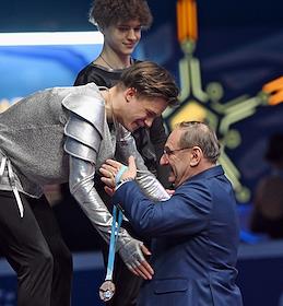 II Всероссийская Спартакиада по зимним видам спорта. Фигурное катание в Ледовом дворце (ЛД) "Металлург". Фигурист Евгений Семененко (слева) во время церемонии награждения.