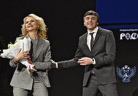 "Форум национальных достижений: образование" в рамках выставки-форума "Россия" на ВДНХ. Пленарная сессия "О ключевых результатах и достижениях науки и высшего образования". Заместитель председателя Правительства России Татьяна Голикова (слева) и первый заместитель председателя Правительства Республики Бурятия Всеволод Мухин (справа) во время пленарной сессии.