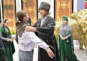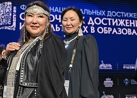 "Форум национальных достижений: образование" в рамках выставки-форума "Россия" на ВДНХ. Пленарная сессия "О ключевых результатах и достижениях науки и высшего образования". Участницы в национальных костюмах во время пленарной сессии.
