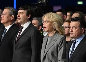 "Форум национальных достижений: образование" в рамках выставки-форума "Россия" на ВДНХ. Пленарная сессия "О ключевых результатах и достижениях науки и высшего образования". Справа налево: губернатор Московской области Андрей Воробьев, заместитель председателя Правительства России Татьяна Голикова, министр просвещения России Сергей Кравцов и глава Республики Башкортостан Радий Хабиров во время пленарной сессии.