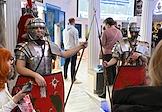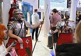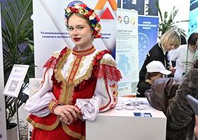 "Форум национальных достижений: образование" в рамках выставки-форума "Россия" на ВДНХ. Пленарная сессия "О ключевых результатах и достижениях науки и высшего образования". Жанровая фотография. Девушка в национальном костюме у стенда Краснодарского края.