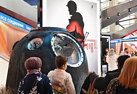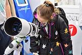 "Форум национальных достижений: образование" в рамках выставки-форума "Россия" на ВДНХ. Пленарная сессия "О ключевых результатах и достижениях науки и высшего образования". Жанровая фотография. Девочка смотрит в телескоп на выставке-форуме.