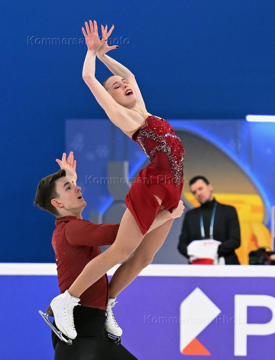 II Всероссийская Спартакиада по зимним видам спорта. Соревнования по фигурному катанию в ЛД "Металлург". Фигуристы Екатерина Чикмарева и Матвей Янченков во время исполнения произвольной программы в парном катании.