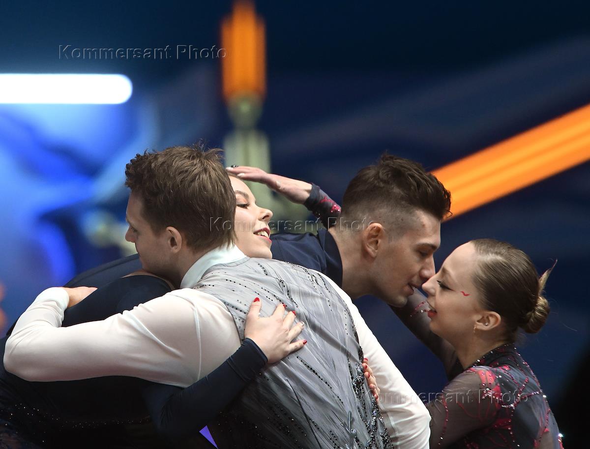 II Всероссийская Спартакиада по зимним видам спорта. Соревнования по фигурному катанию в ЛД "Металлург". Церемония награждения победителей в парном катании. Слева направо: фигуристы Дмитрий Козловский, Анастасия Мишина, Александр Галлямов и Александра Бойкова во время церемонии.