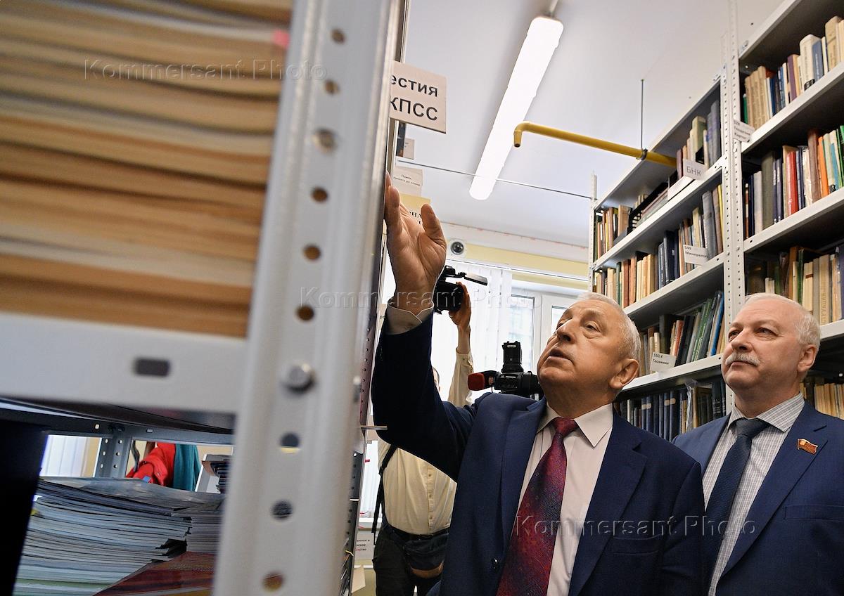 Кандидат на выборах на должность президента России от КПРФ, председатель комитета Государственной думы России по развитию Дальнего Востока и Арктики Николай Харитонов (слева) и генеральный директор ООО "Институт геотехники и инженерных изысканий в строительстве" Михаил Богданов (в центре) во время посещения ООО "Институт геотехники и инженерных изысканий в строительстве" и встреча с сотрудниками института.