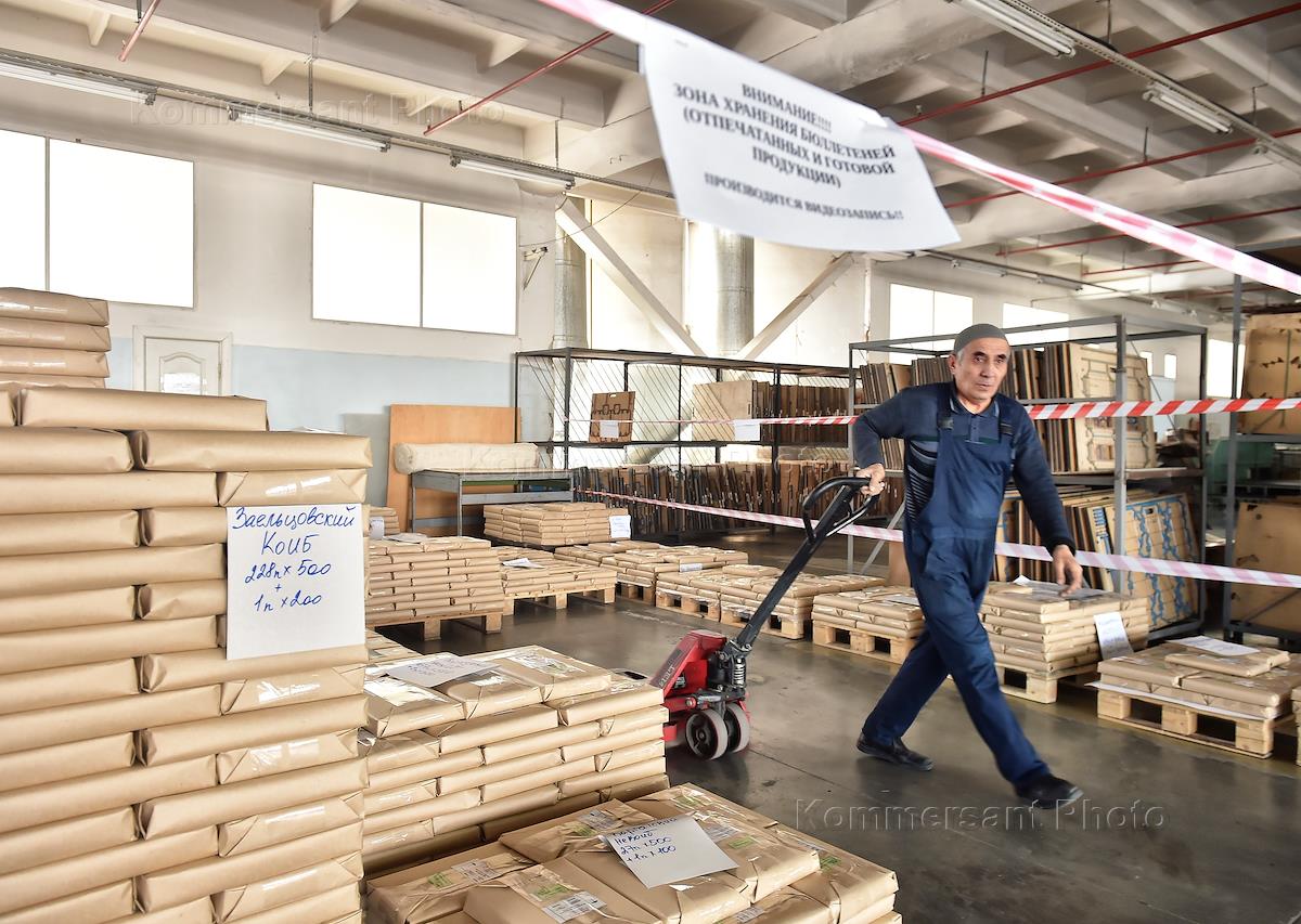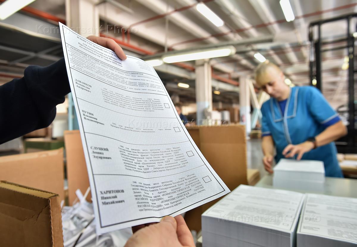 Печать избирательных бюллетеней для голосования на выборах президента России, которые пройдут с 15 по 17 марта 2024 года, в типографии "Советская Сибирь". Жанровая фотография.