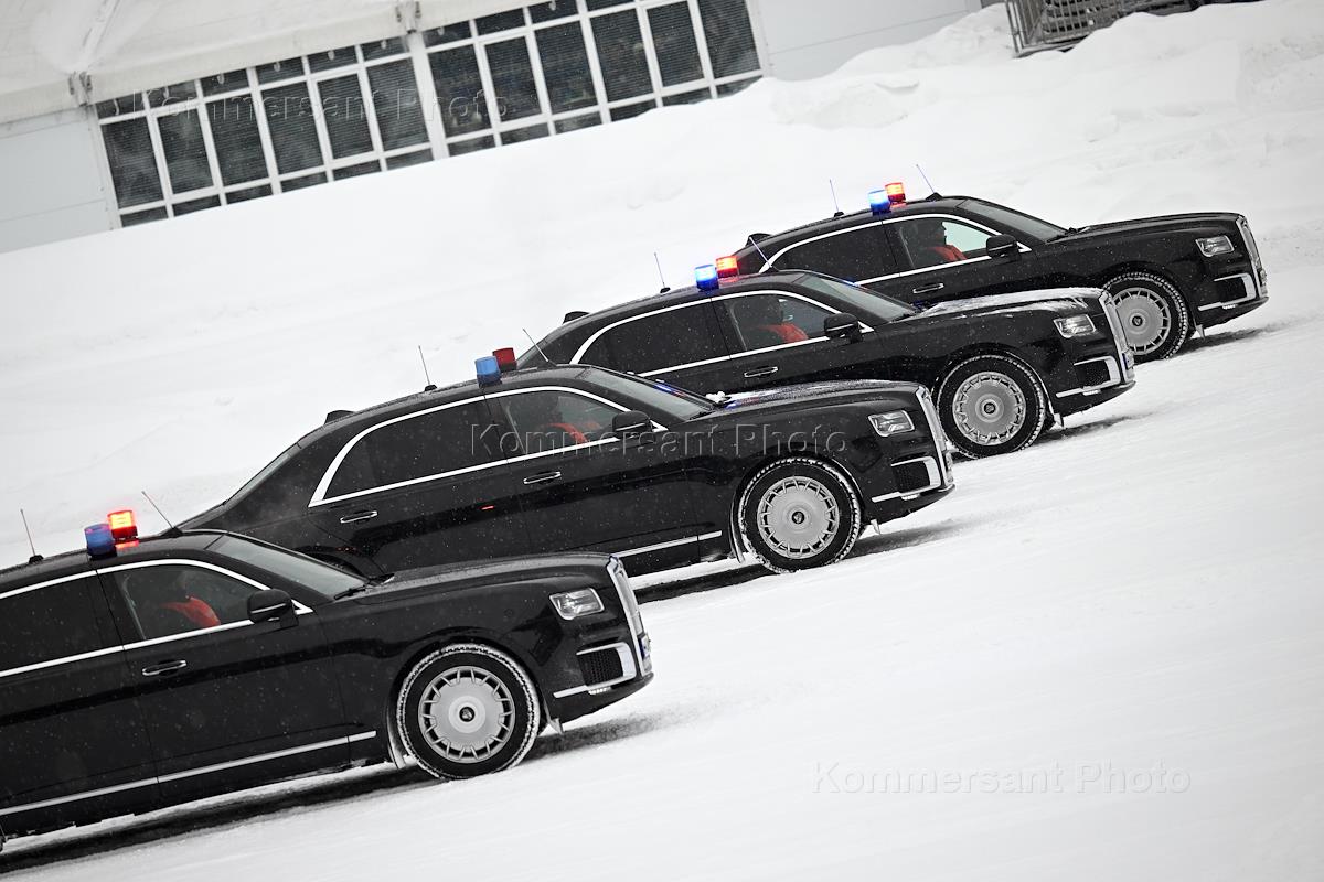 Соревнования по скоростному маневрированию в зимних условиях среди водителей Гаража особого назначения Федеральной службы охраны (ФСО) на автодроме ФСО в городе Старая Купавна Богородского городского округа. Жанровая фотография. Автомобили Aurus перед началом соревнований.
