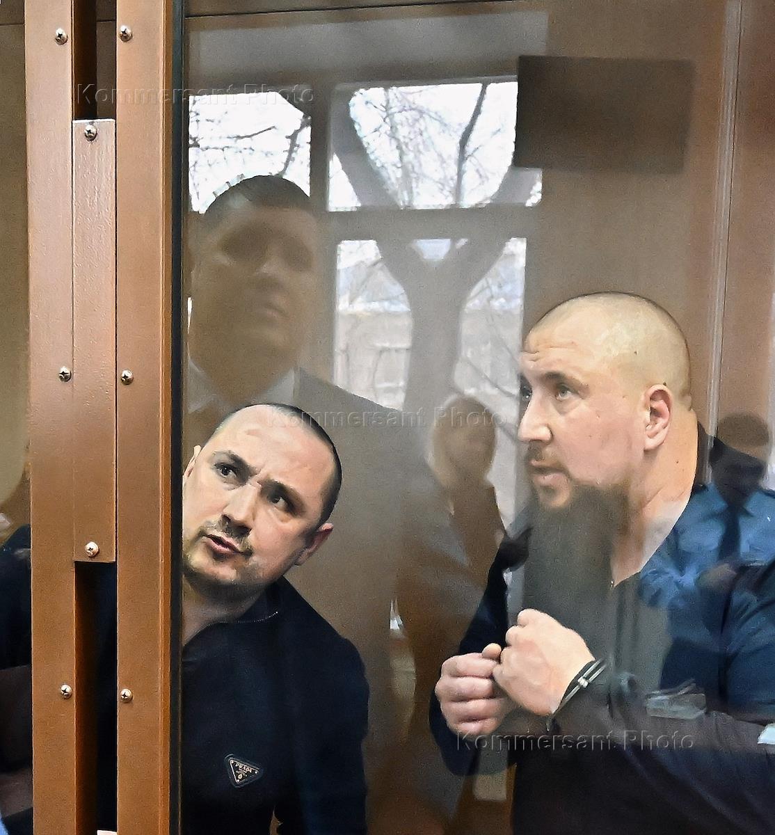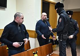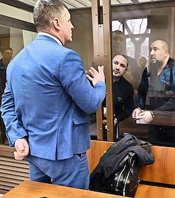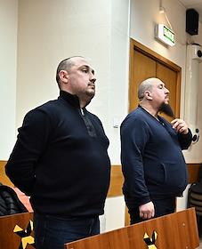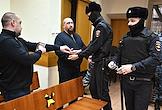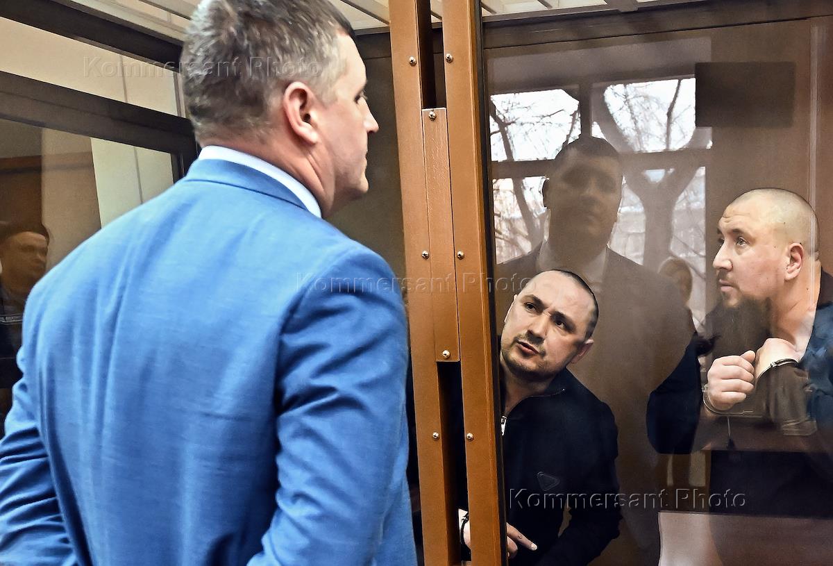 Заседание по делу по обвинению сотрудников ЧОПа Сергея Гребенюкова и Романа Московского по делу о разбойном нападении и воспрепятствовании законной деятельности журналиста фотокорреспондента газеты "Коммерсантъ" Анатолия Жданова в Дорогомиловском районном суде. Обвиняемые по делу, сотрудники ЧОПа Сергей Гребенюков (второй слева) и Роман Московский (слева) во время заседания суда.