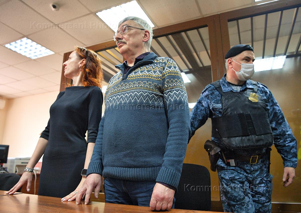 Оглашение приговора правозащитнику и сопредседателю "Мемориала" (признан в России иноагентом) Олегу Орлову (признан в России иноагентом), обвиняемому в "повторной дискредитации" армии за публикацию статьи с критикой специальной военной операции (СВО) на Украине и российской власти, в Головинском районном суде. Правозащитник и сопредседатель "Мемориала" (признан в России иноагентом) Олег Орлов (признан в России иноагентом) (слева) перед началом заседания суда.