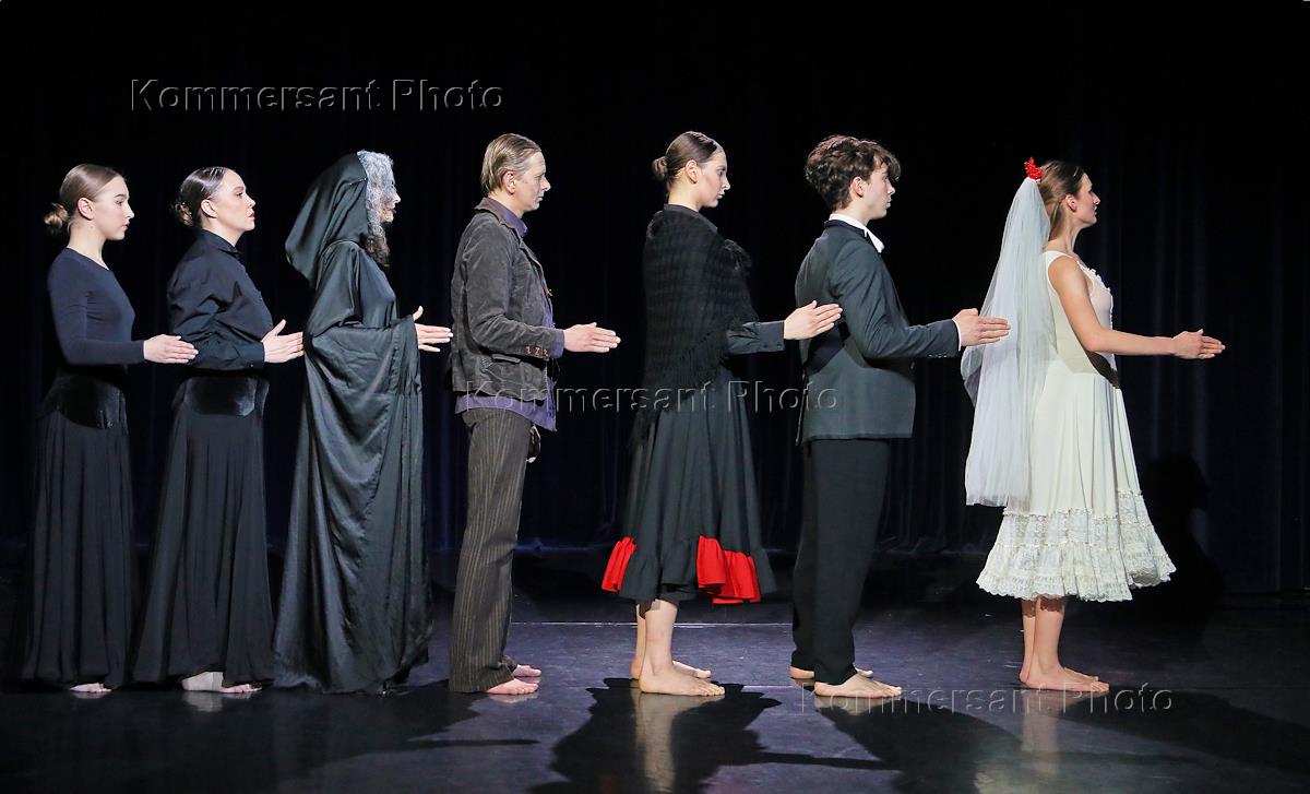 Пластический спектакль "Дети Луны" по пьесе Федерико Гарсиа Лорки "Кровавая свадьба" Пластического театра "Созвездие" в постановке режиссера Надежды Беляковой на сцене Фольклорного центра "Москва". Артисты Анастасия Шевченко и Никита Чурашов на сцене во время спектакля.