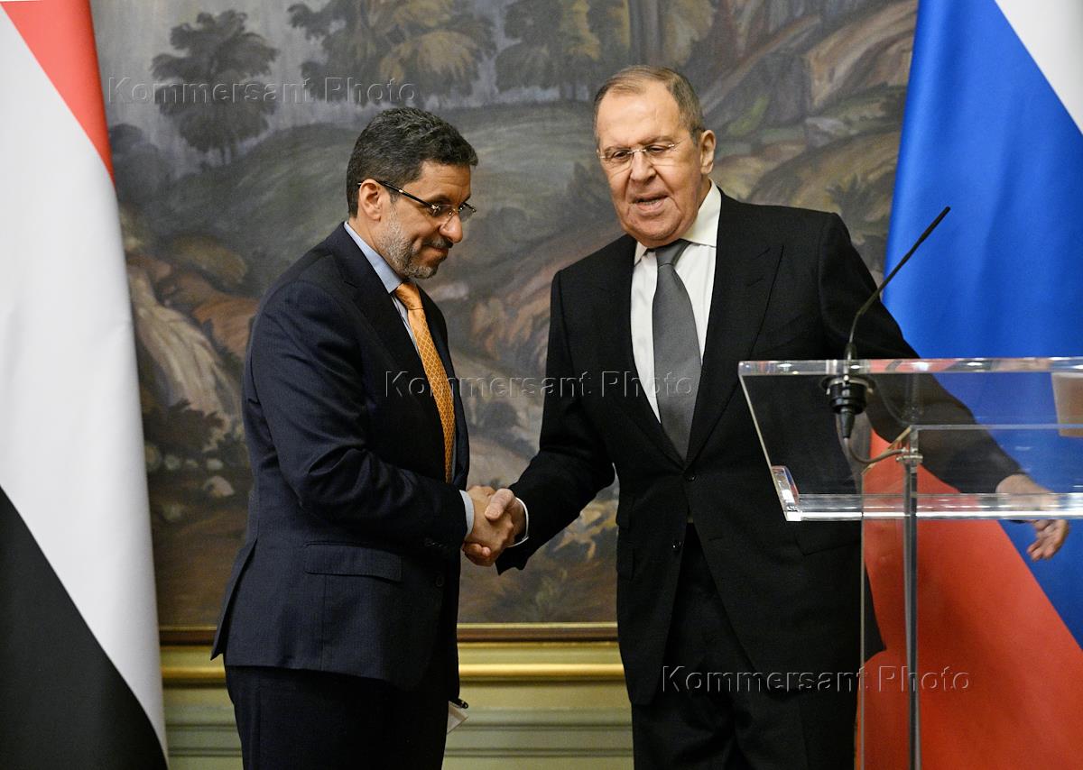 Переговоры министра иностранных дел России Сергея Лаврова и министра и по делам соотечественников за рубежом Йемена Ахмеда Авада Бен Мубарака в Доме приемов МИД России. Министр иностранных дел России Сергей Лавров (справа) и министр иностранных дел и по делам соотечественников за рубежом Йемена Ахмед Авад Бен Мубарак (слева) во время пресс-конференции по итогам переговоров.