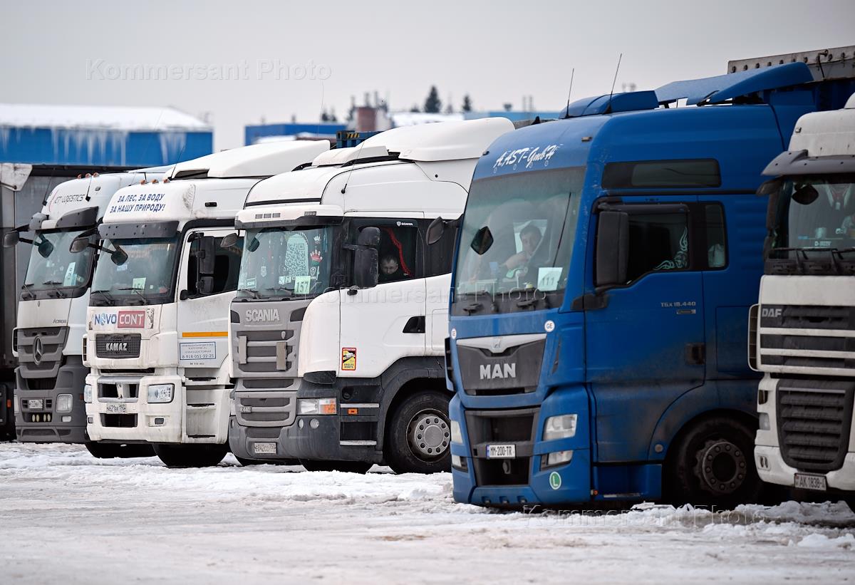 Досмотр, проверка и оформление цветочной продукции сотрудниками Федеральной таможенной службы (ФТС) на Ленинградском таможенном посту перед праздником 8 Марта. Жанровая фотография. Грузовые автомобили в зоне таможенного контроля.