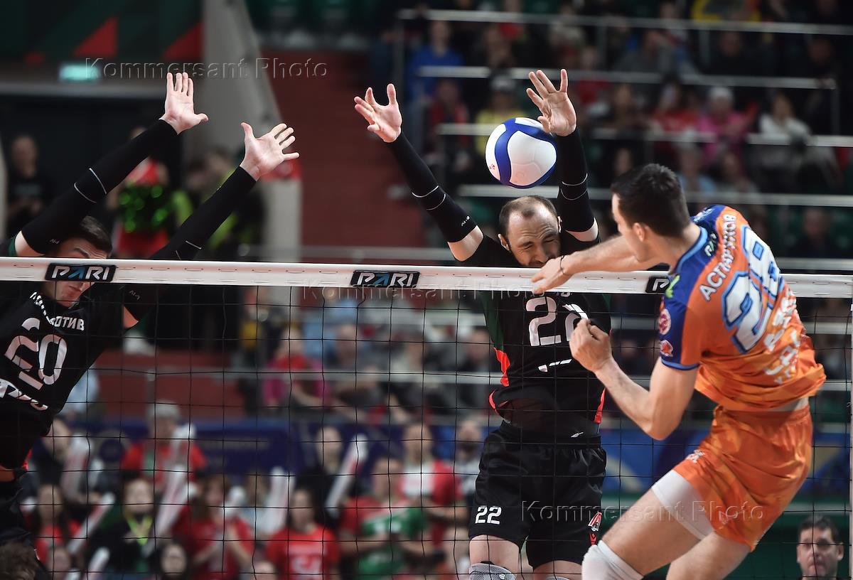 Чемпионат России по волейболу 2024. PARI Суперлига. 26-й тур. Матч между командами "Локомотив" (Новосибирск) - "Кузбасс" (Кемерово) на стадионе "Локомотив-Арена". Игроки команды "Локомотив" Омар Курбанов (в центре) и игрок команды "Кузбасс" Аспарух Аспарухов (справа) во время матча.