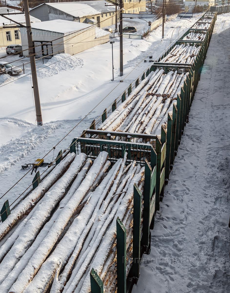 Грузовые перевозки на железной дороге. Жанровая фотография. Железнодорожные вагоны для перевозки леса.