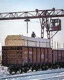 Грузовые перевозки на железной дороге. Жанровая фотография. Погрузка пиломатериалов в железнодорожные вагоны.