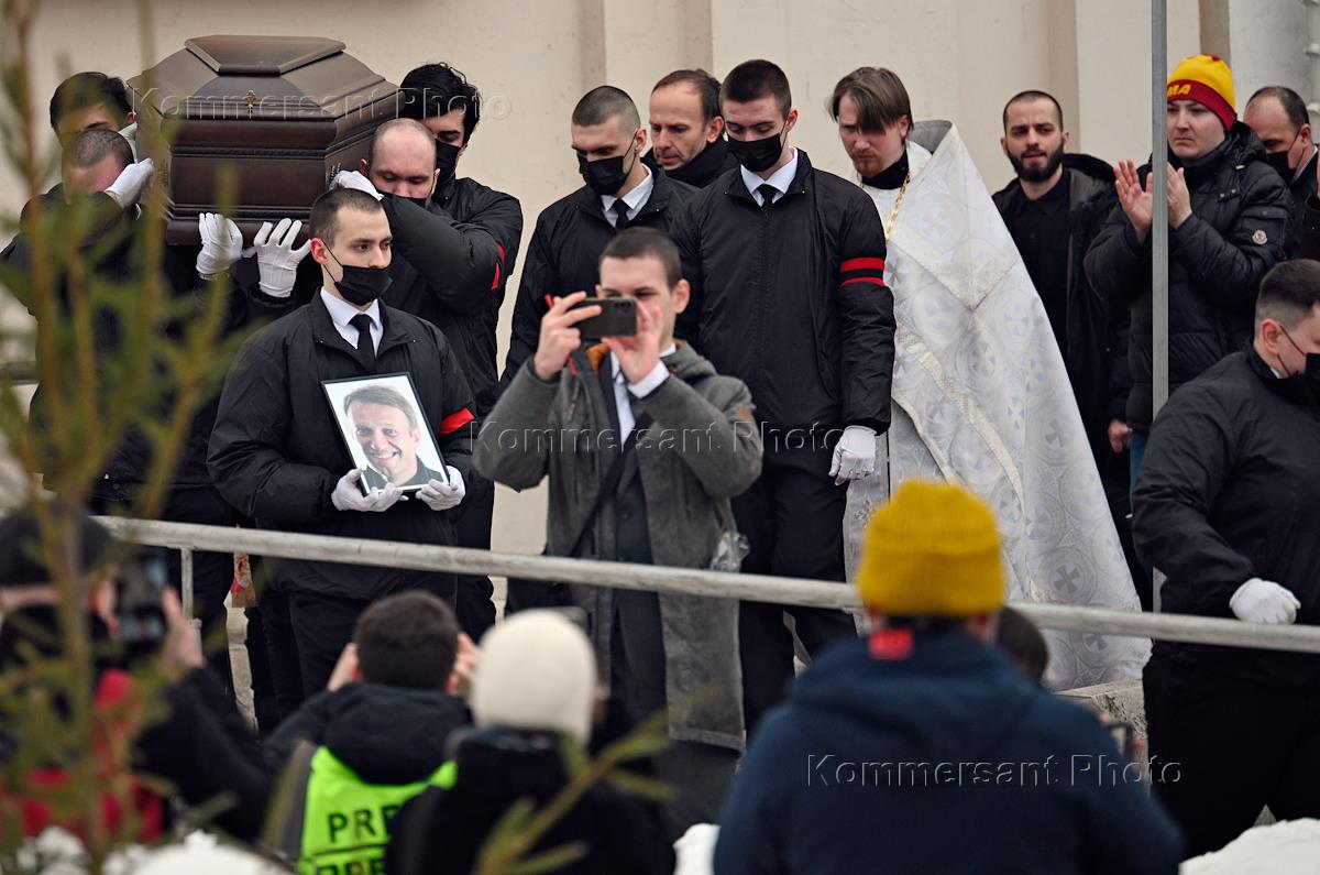 Чин отпевания политика Алексея Навального в церкви иконы Божией Матери "Утоли моя печали" в Марьино. Вынос фотографии Алексея Навального после обряда.