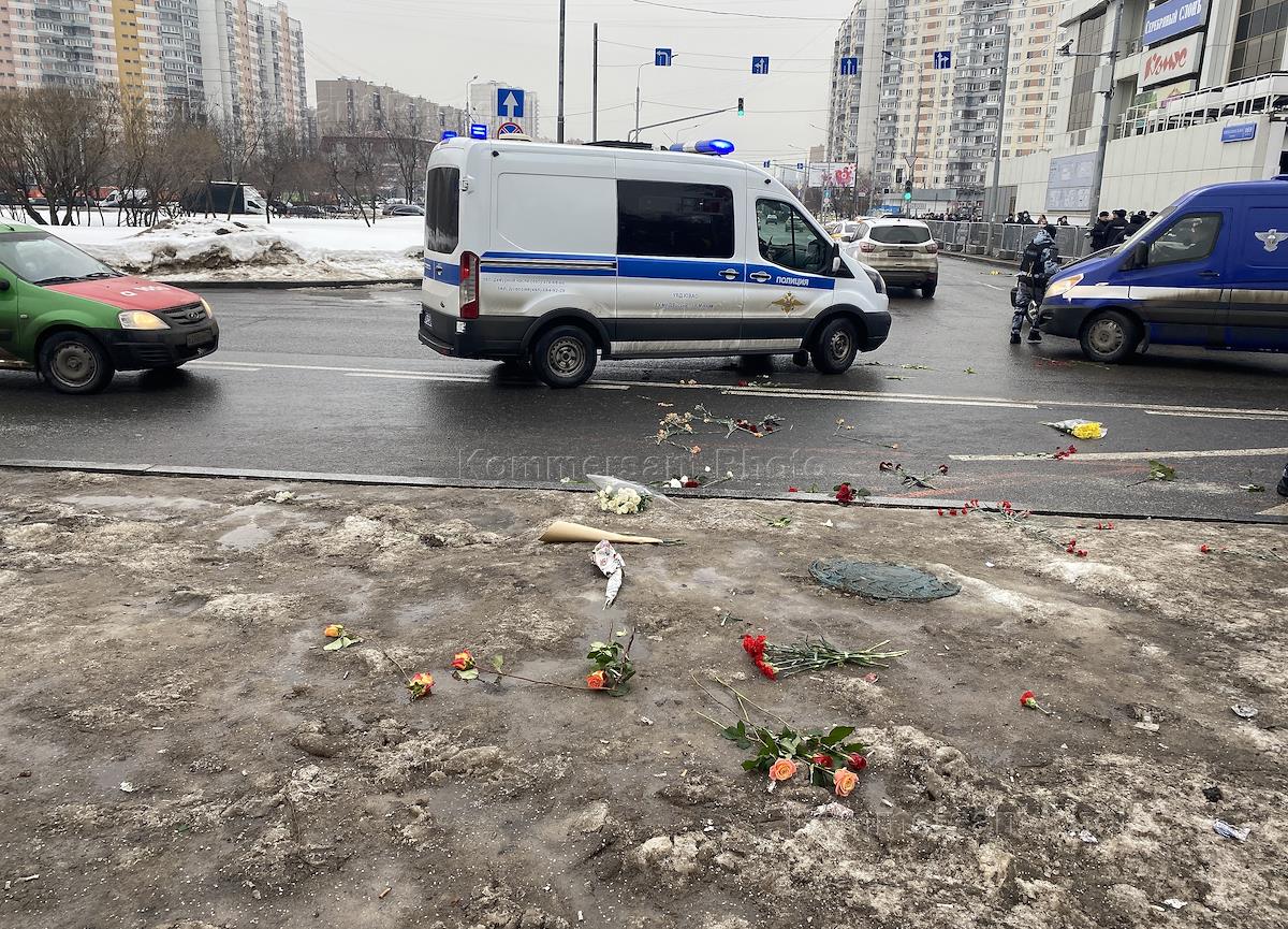 Funeral of opposition leader Alexei Navalny at Borisovskoye Cemetery. Utility workers remove flowers from the road.