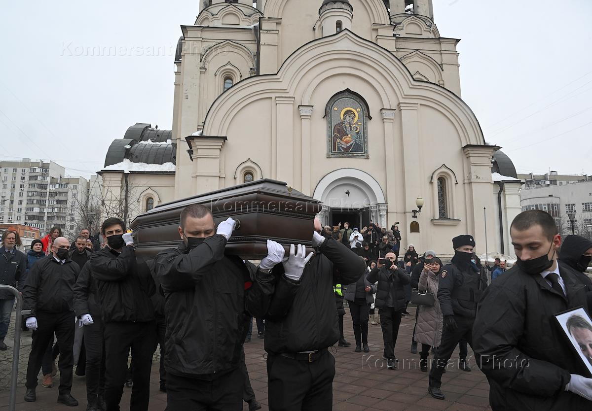 Funeral service for opposition leader Alexei Navalny in the Church of the Icon of the Mother of God “Quench My Sorrows” in Maryino. Carrying out the coffin after the ceremony.