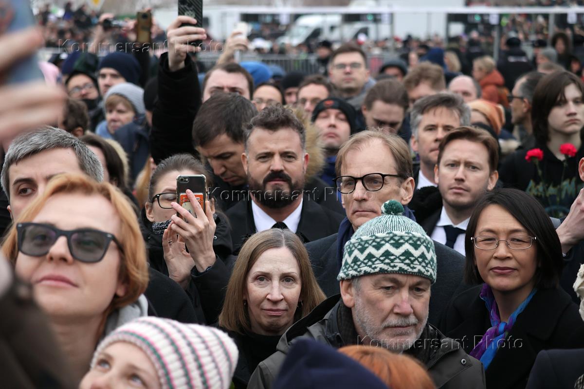Похороны политика Алексея Навального на Борисовском кладбище. Посол Соединенных Штатов Америки (США) в России Линн Трейси (в центре) и заместитель посла Великобритании в России Том Додд (четвертый справа) во время похорон.