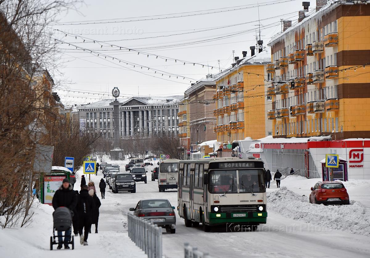 Views of Vorkuta. Genre photography. A passenger bus while driving along Lenin Street.