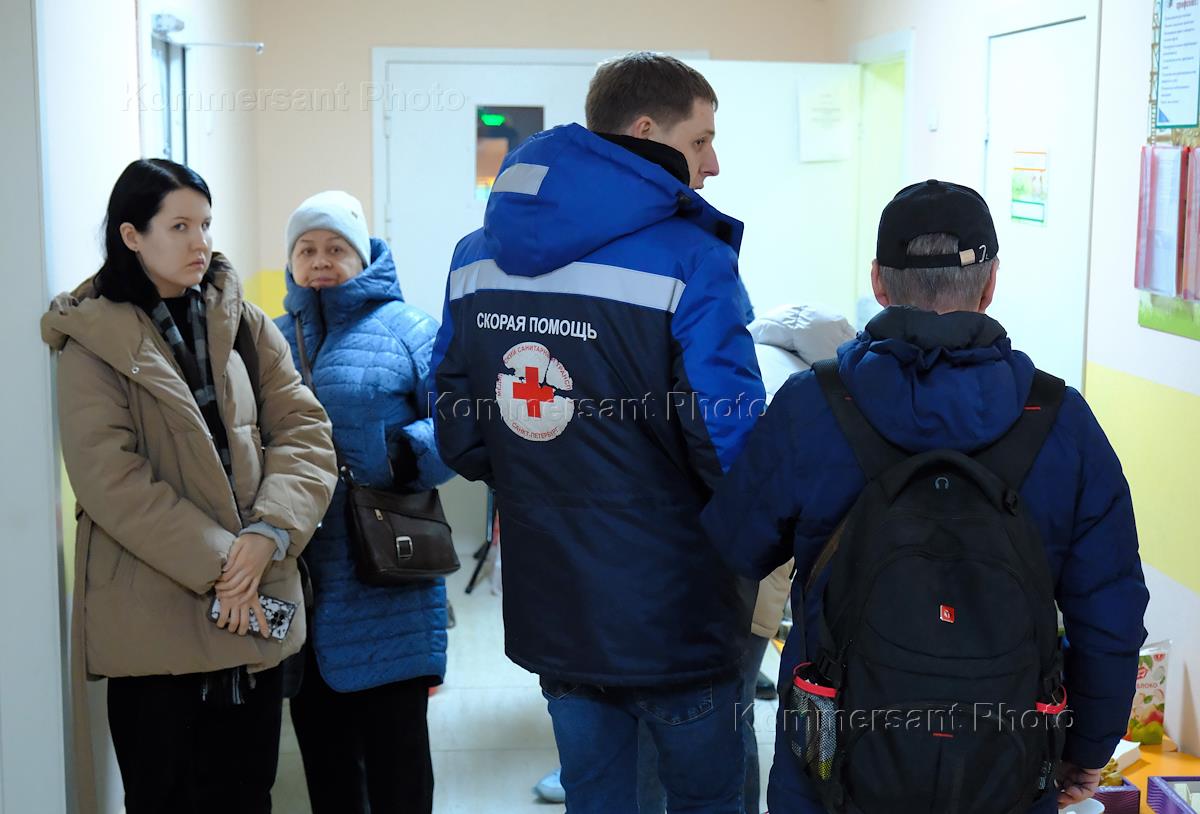 Последствия попадания беспилотника (БПЛА) в дом №161 на Пискарёвском проспекте и взрыва. Жильцы пострадавших домов в здании детского сада.