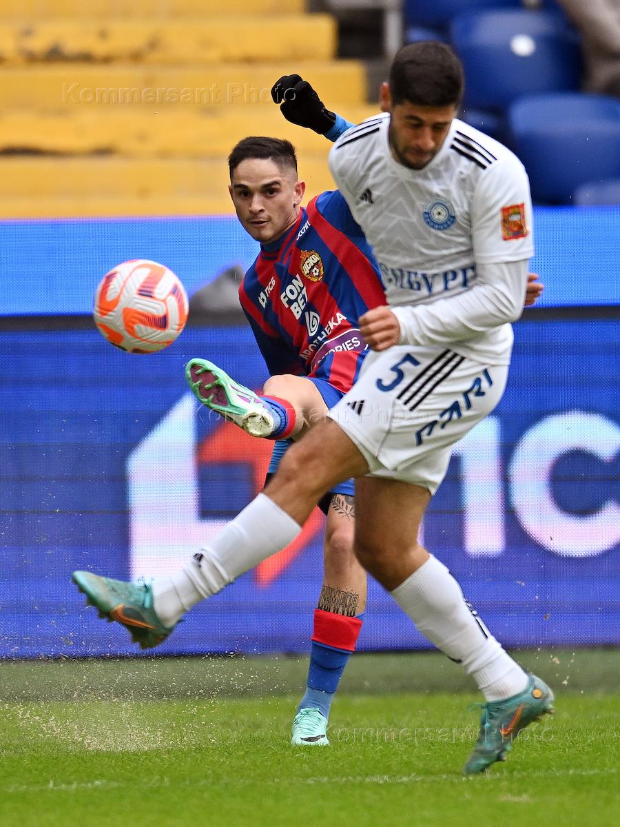Russian Premier League (RPL). MIR - Russian Football Championship 2023/2024. 19th round. Match between the teams CSKA (Moscow) - Orenburg (Orenburg) at the VEB Arena stadium. CSKA team player Victor Davila (right) and Orenburg team player Matias Perez (left) during the match.