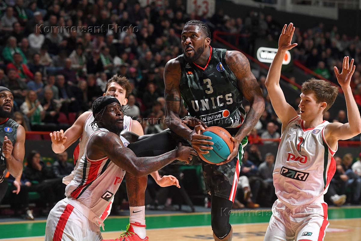 VTB United Basketball League. Match between the teams UNICS (Kazan) - Lokomotiv-Kuban (Krasnodar) at the Basket Hall sports arena. UNICS player Jalen Reynolds (center) during the match.