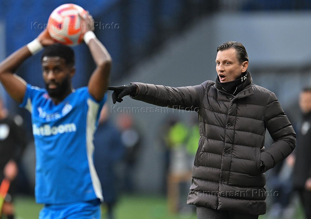 Российская Премьер-Лига (РПЛ). МИР - Чемпионат России по футболу 2023/2024. 19-й тур. Матч между командами "Динамо" (Москва) - "Локомотив" (Москва) на стадионе "ВТБ Арена - Центральный стадион Динамо им. Льва Яшина". Главный тренер команды "Локомотив" Михаил Галактионов (справа) во время матча.