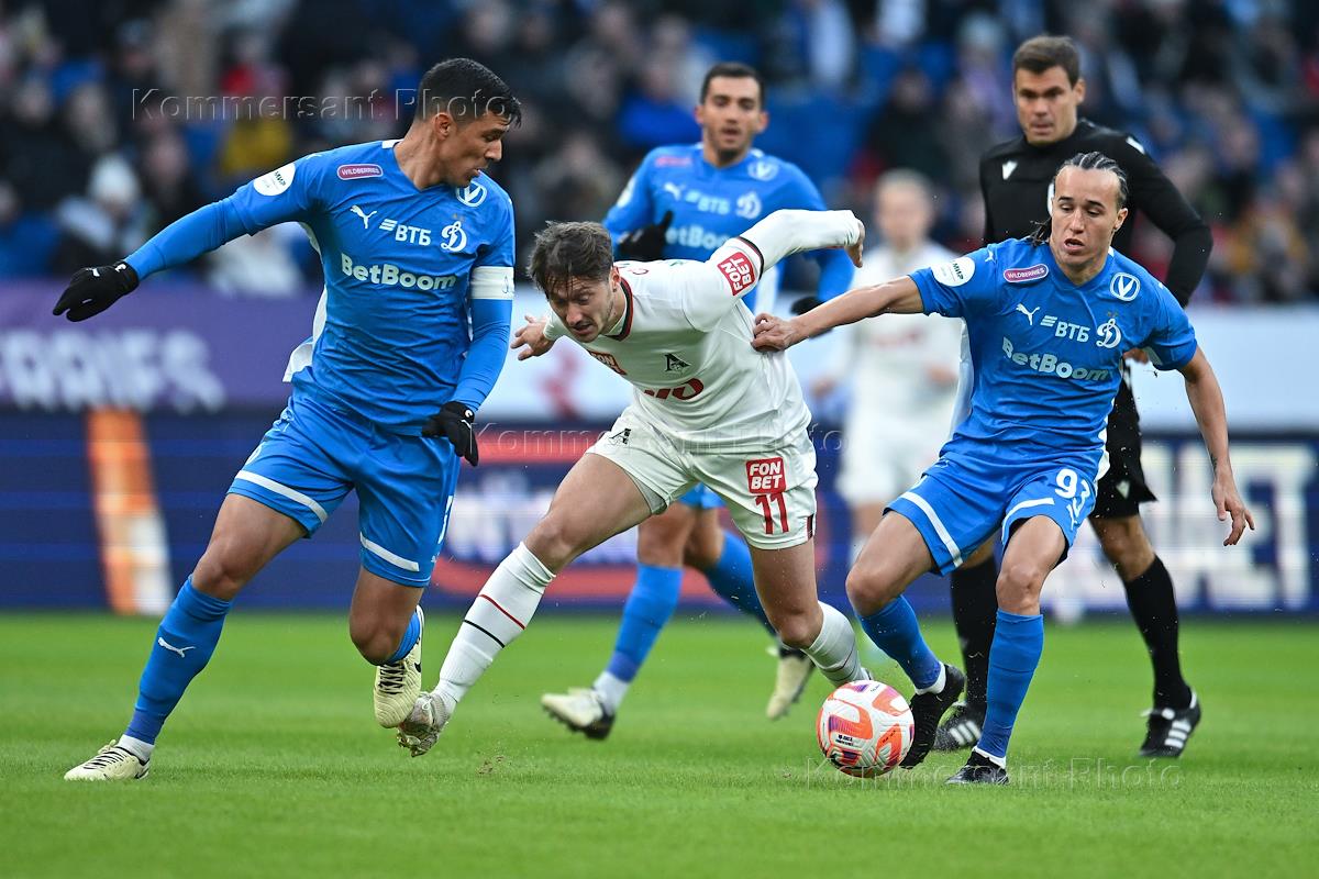 Российская Премьер-Лига (РПЛ). МИР - Чемпионат России по футболу 2023/2024. 19-й тур. Матч между командами "Динамо" (Москва) - "Локомотив" (Москва) на стадионе "ВТБ Арена - Центральный стадион Динамо им. Льва Яшина". Жанровая фотография.