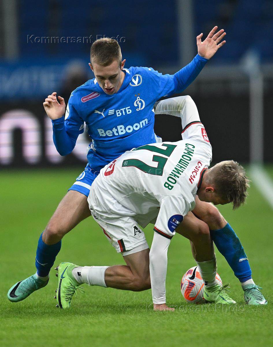 Российская Премьер-Лига (РПЛ). МИР - Чемпионат России по футболу 2023/2024. 19-й тур. Матч между командами "Динамо" (Москва) - "Локомотив" (Москва) на стадионе "ВТБ Арена - Центральный стадион Динамо им. Льва Яшина". Игрок команды "Динамо" Дмитрий Скопинцев (справа) во время матча.