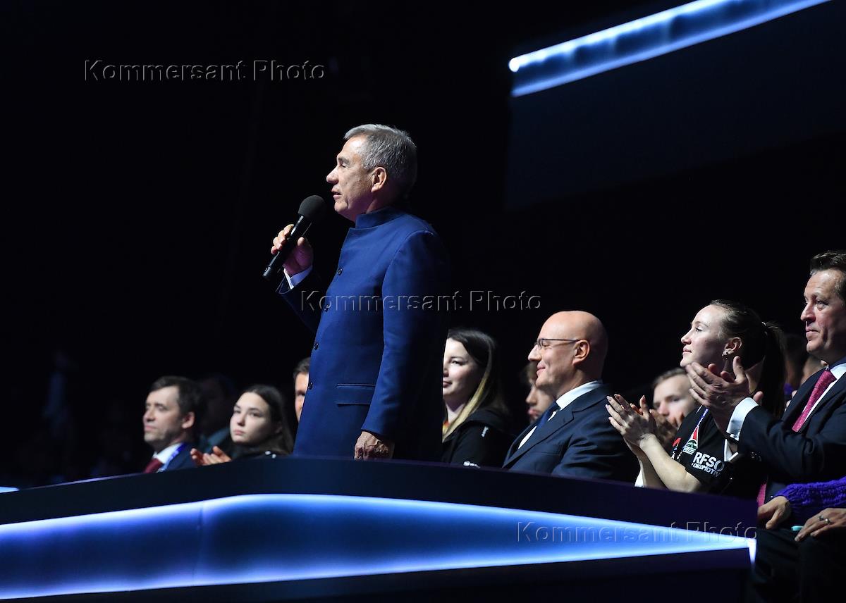 Closing ceremony of the international tournament "Games of the Future" at the Kazan-Expo International Exhibition Center in the village of Bolshie Kabany. Head of the Republic of Tatarstan Rustam Minnikhanov (center) and Deputy Prime Minister of Russia Dmitry Chernyshenko (third from right) during the ceremony. Minnikhanov Rustam, head of the Republic of Tatarstan.