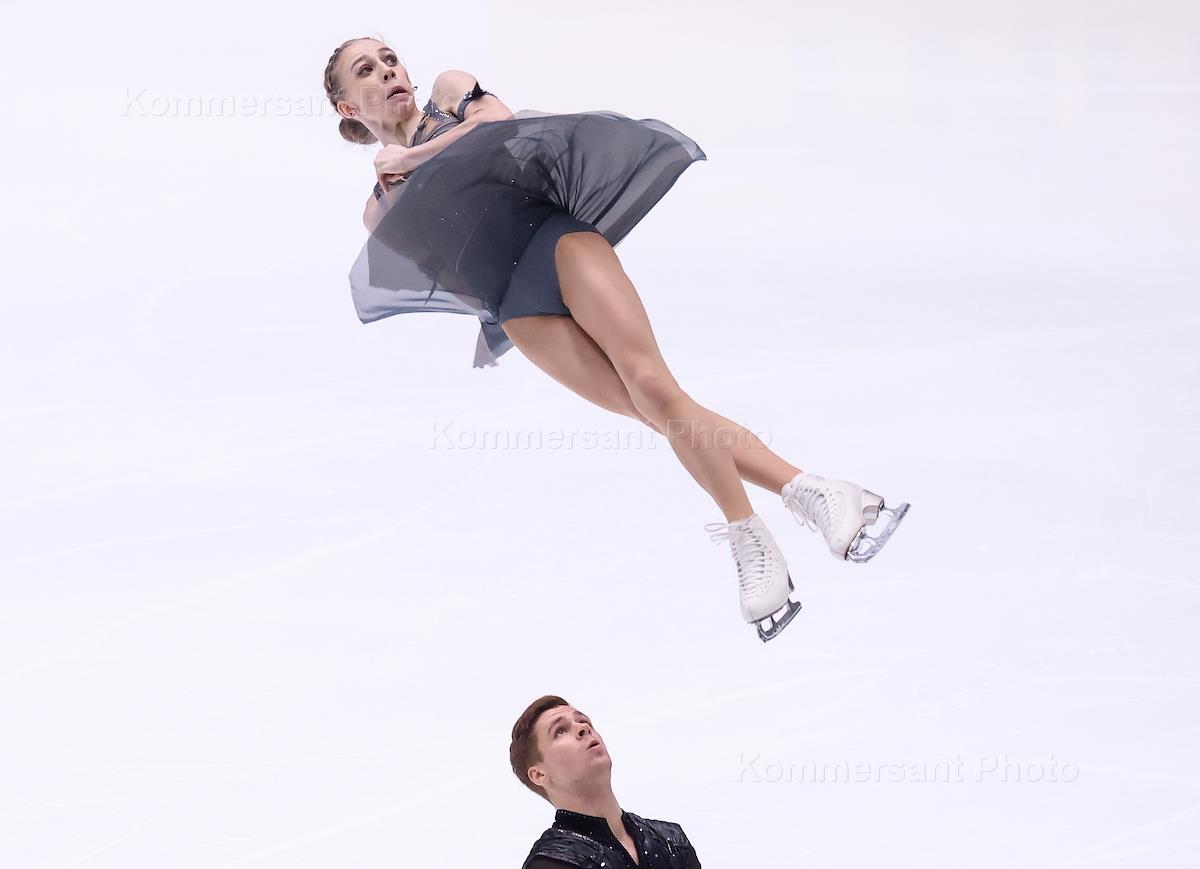 Тинькофф - Кубок Первого канала по фигурному катанию 2024 в ледовом дворце "Юбилейный". Танцы на льду. Произвольная программа. Фигуристы Софья Шевченко и Андрей Ежлов во время выступления.