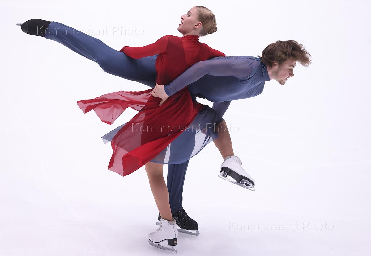 Тинькофф - Кубок Первого канала по фигурному катанию 2024 в ледовом дворце "Юбилейный". Танцы на льду. Произвольная программа. Фигуристы Софья Шевченко и Андрей Ежлов во время выступления.