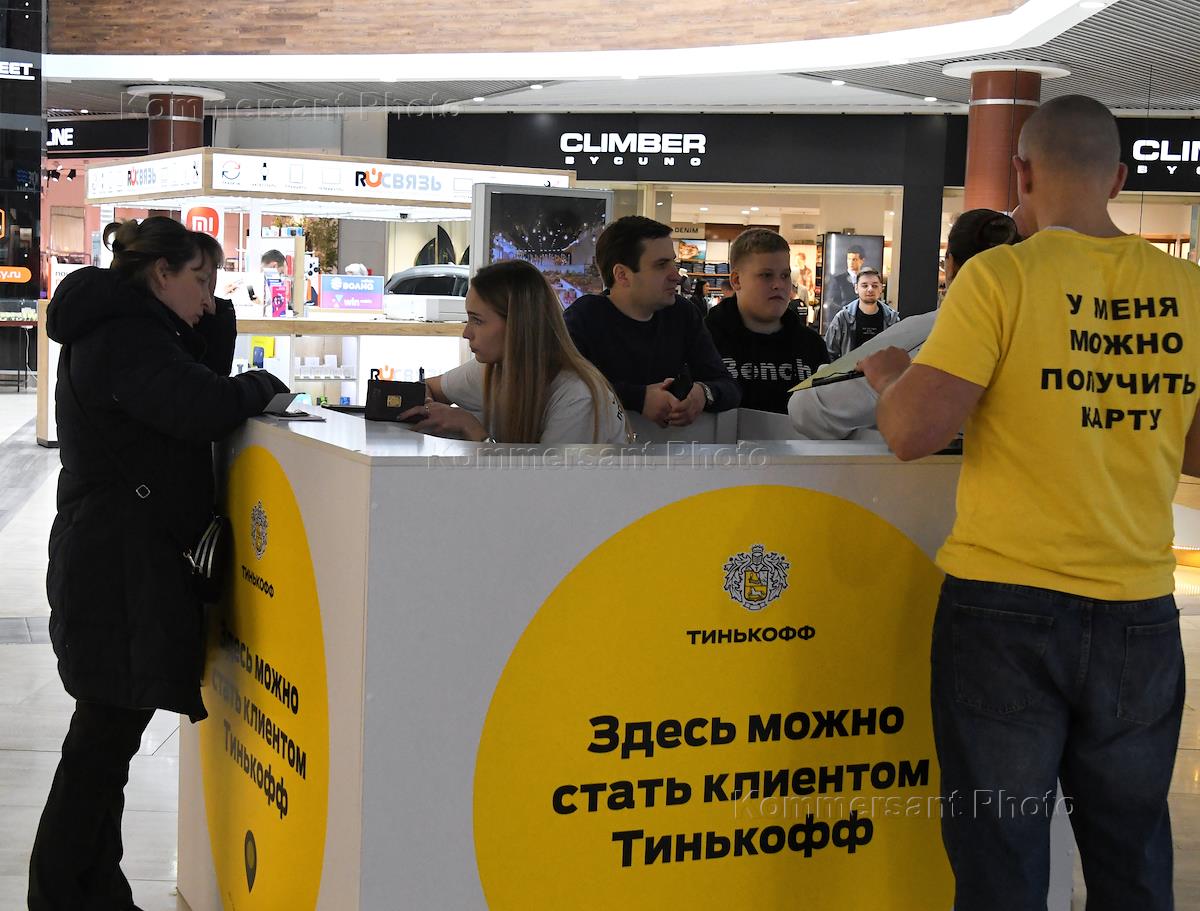 Работа "Тинькофф банк" в Крыму. Представители банка оформляют и выдают дебетовые и кредитные карты жителям Крыма в торговом центре.