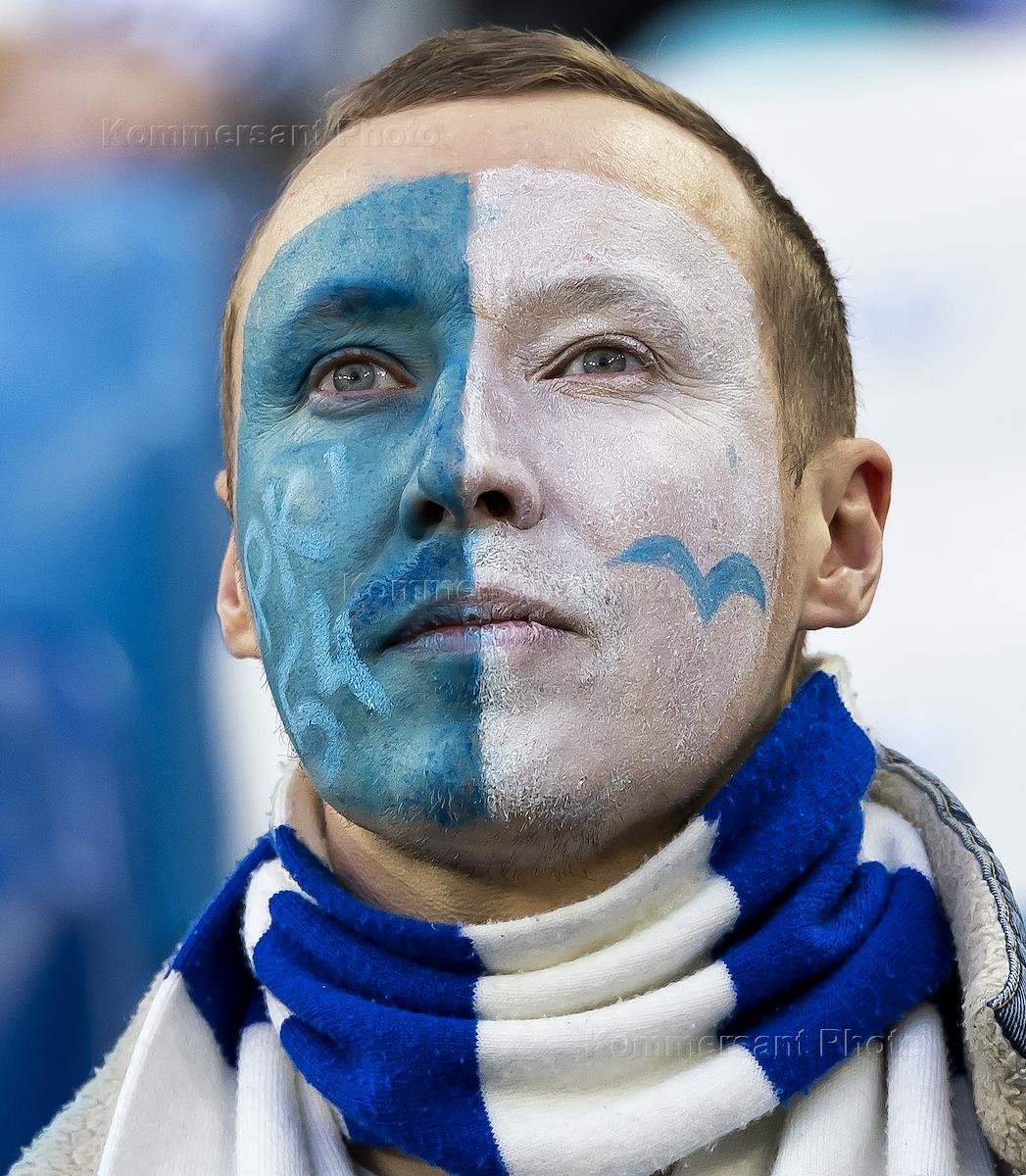 Российская Премьер-Лига (РПЛ). МИР - Чемпионат России по футболу 2023/2024. 19-й тур. Матч между командами "Балтика" (Калининград) - "Сочи" (Сочи) на стадионе "Ростех Арена". Жанровая фотография. Болельщик команды "Балтика" на трибуне стадиона.