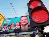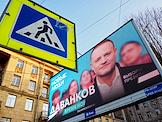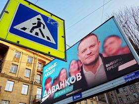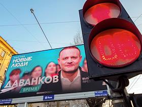 Election propaganda for the Russian presidential elections on a city street. Genre photography. Advertising stand of presidential candidate from the New People party Vladislav Davankov.