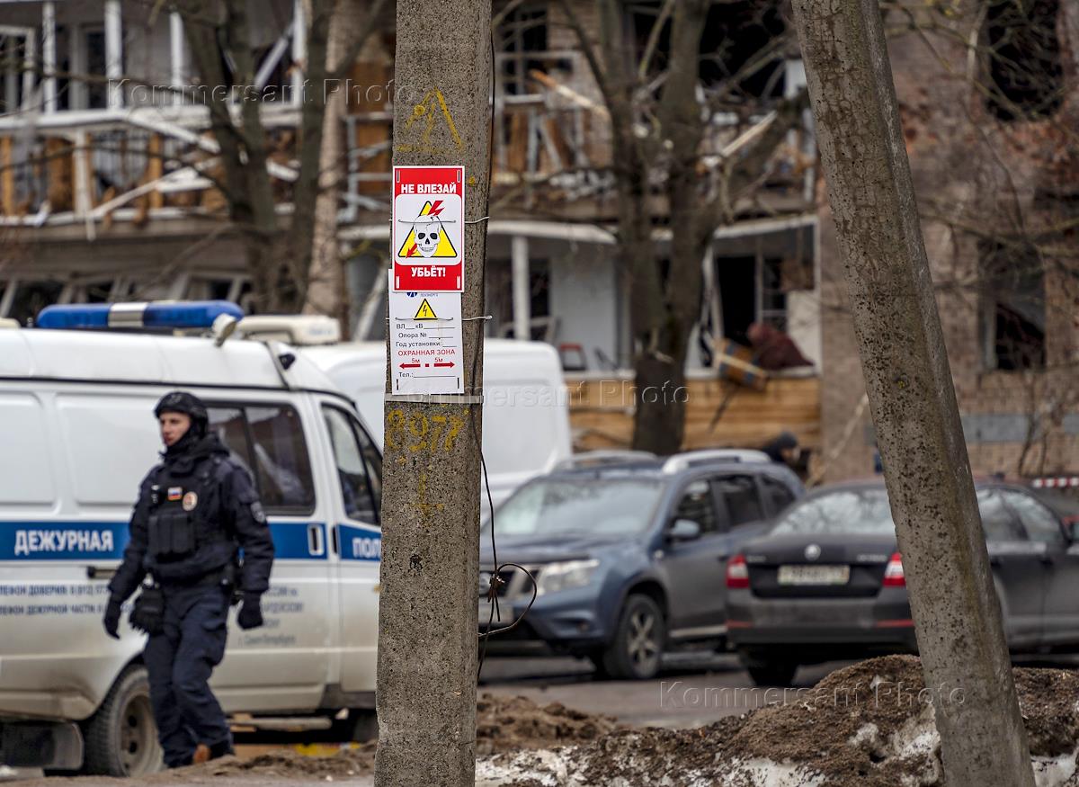 Последствия попадания беспилотника (БПЛА) в дом №161 на Пискарёвском проспекте и взрыва. Жилой дом, поврежденный в результате чрезвычайного происшествия. Сотрудники МВД России на месте попадания.