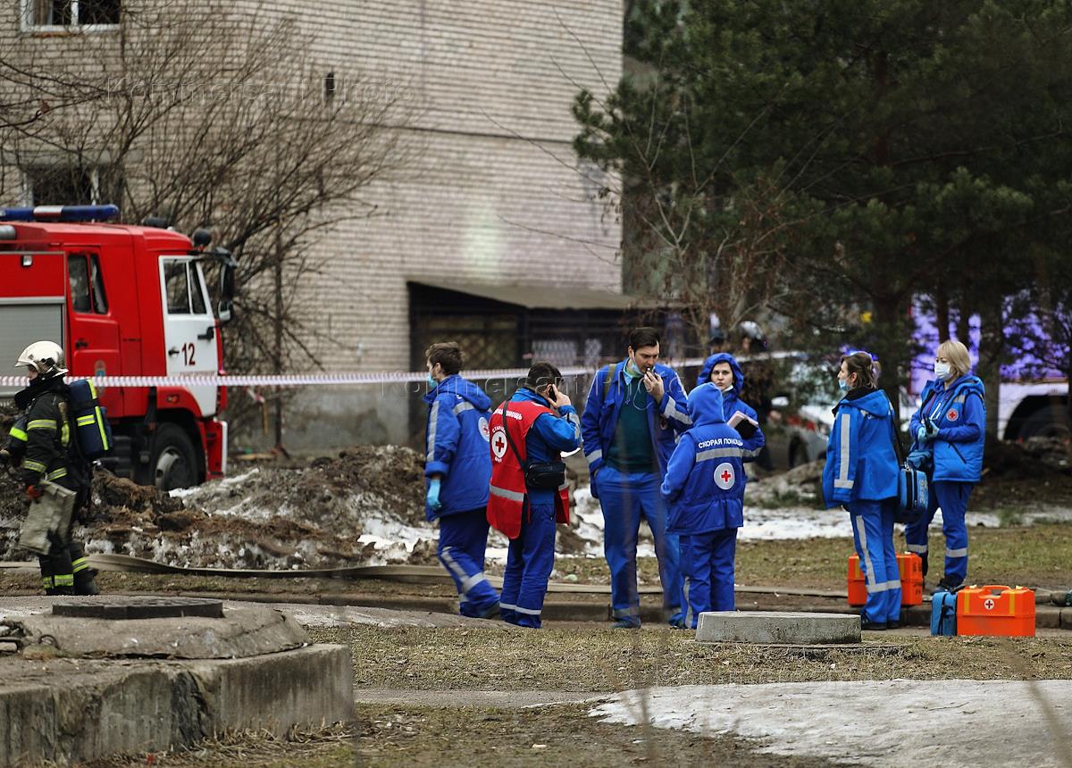 Consequences of a drone (UAV) hitting house No. 161 on Piskarevsky Prospekt and an explosion. A residential building damaged as a result of an emergency. Emergency medical personnel at the house.