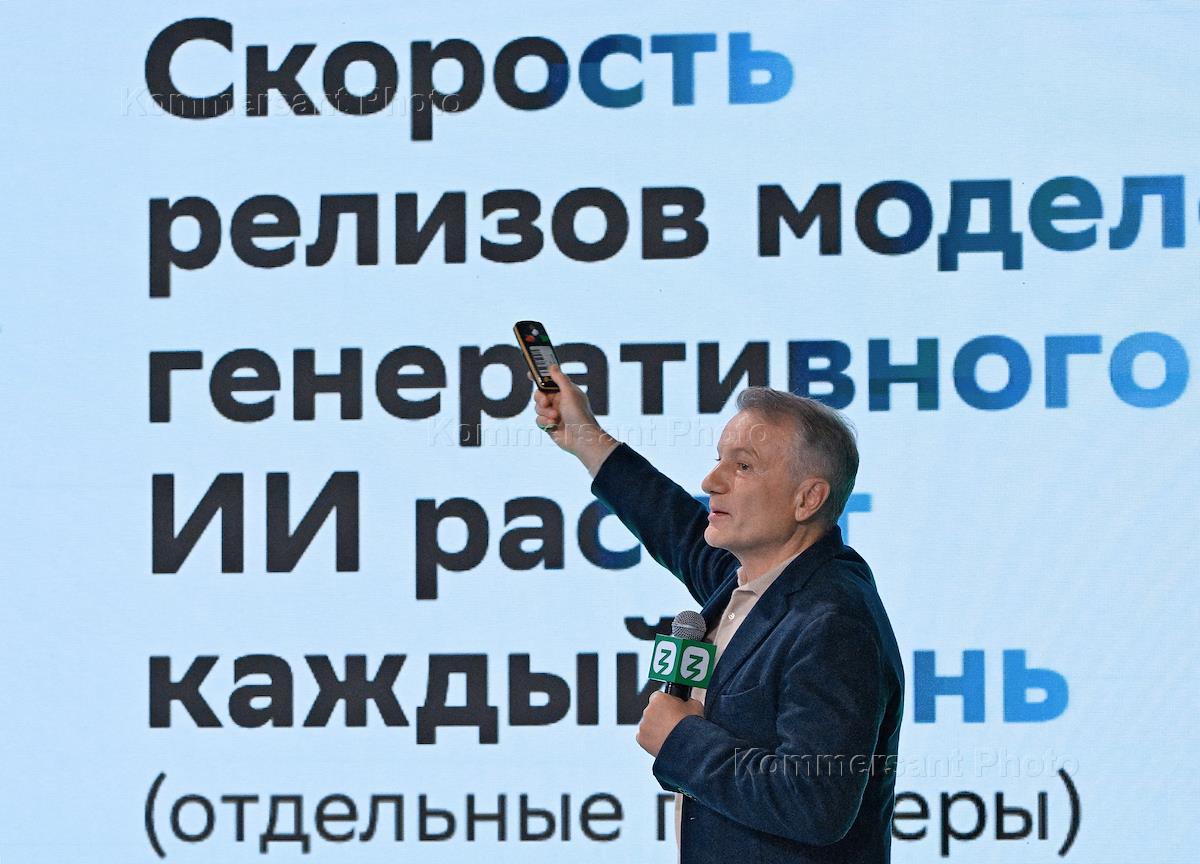 Всемирный фестиваль молодежи на Федеральной территории "Сириус". Открытый диалог "ИИ – инструмент человека для достижения целей". Президент, председатель правления Сбербанка России Герман Греф во время выступления на диалоге.