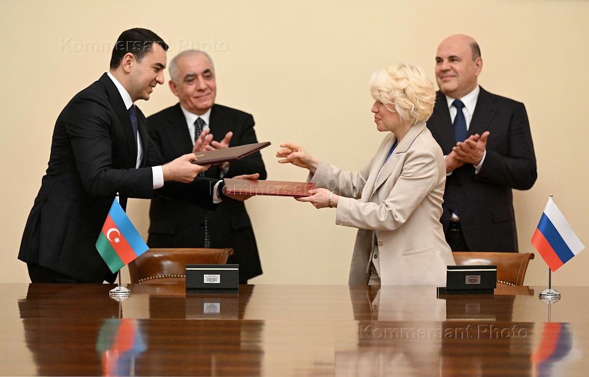 Рабочий визит председателя правительства России Михаила Мишустина в Азербайджан. Российско-азербайджанские переговоры. Справа налево: председатель правительства России Михаил Мишустин, заместитель министра культуры Россиии Надежда Преподобная, премьер-министр Азербайджана Али Асадов и министр культуры Азербайджана Керимли Адиль Габиль оглы Керимли во время церемонии подписания документов по итогам переговоров.