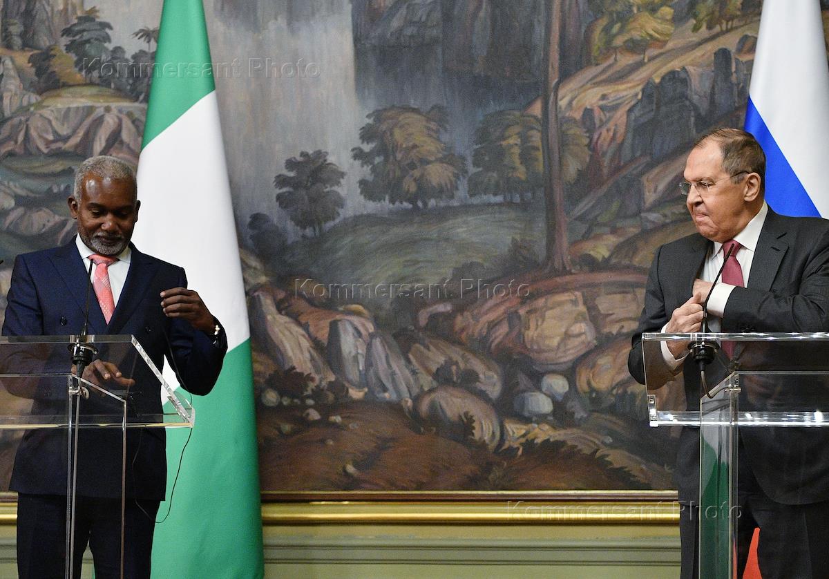 Negotiations between Russian Foreign Minister Sergei Lavrov and the Minister of Foreign Affairs of the Federal Republic of Nigeria, Yusuf Tuggar, at the Reception House of the Russian Foreign Ministry. Russian Foreign Minister Sergei Lavrov (center) and Foreign Minister of the Federal Republic of Nigeria Yusuf Tuggar (right) before a press conference following the negotiations.