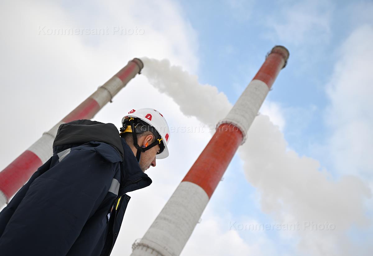 Усть-Илимская ТЭЦ (входит в компанию в "Эн+", основанную Олегом Дерипаской). Трубы ТЭЦ. Сотрудник на территории ТЭЦ.