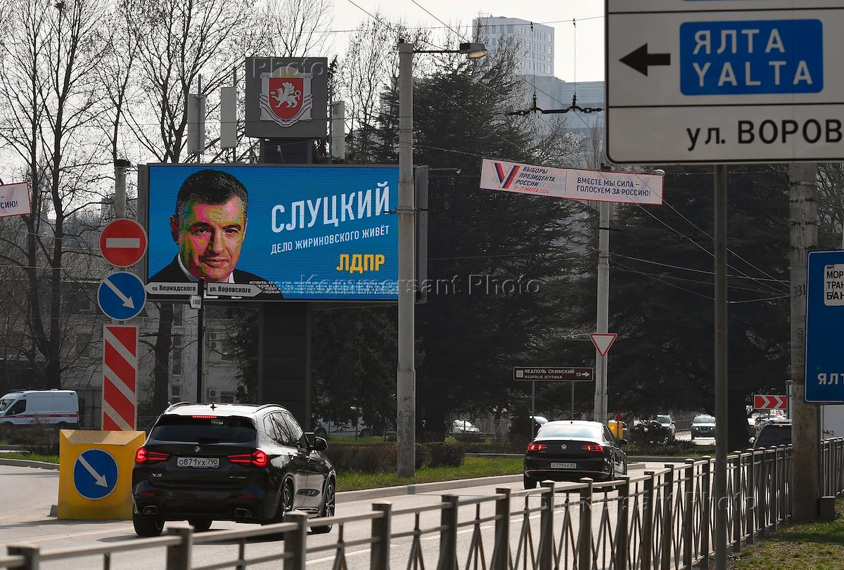 Transfer of produced ballots for voting in the elections of the President of the Russian Federation by the Tavrida printing house to the Election Commission of the Republic of Crimea. Chairman of the Election Commission of the Republic of Crimea Mikhail Malyshev and Secretary of the Crimean Election Commission Natalya Bezruchenko. Propaganda posters dedicated to the election campaign for the Russian presidential election on the streets of the city.