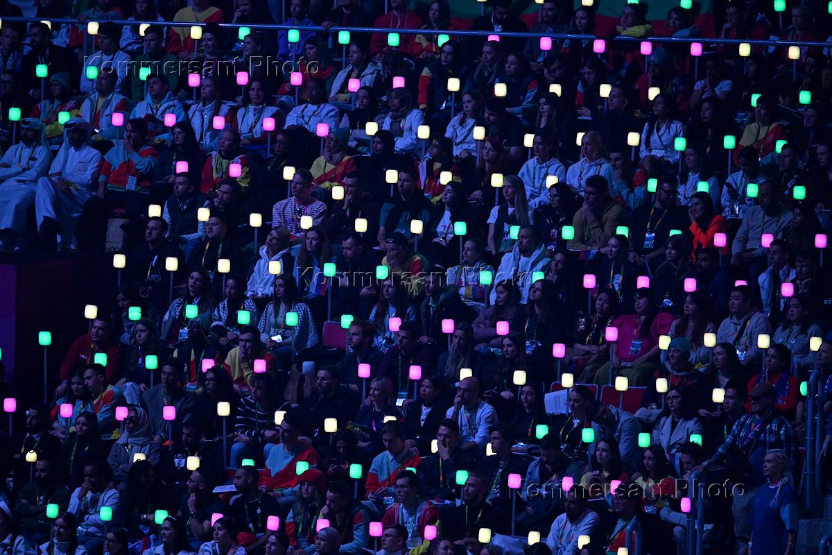 Всемирный фестиваль молодежи 2024" на Федеральной территории "Сириус". Церемония закрытия фестиваля на территории Дворца спорта "Большой" (международный молл "Арт.Молодость"). Участники в зале дворца на трибунах.